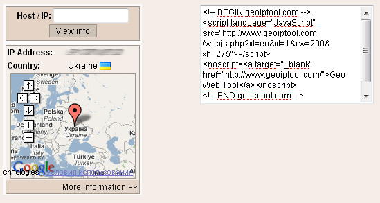 Весьма приятный англоязычный сервис. Показывает информацию об ip, а также geo положение на карте. В принципе, дополнительных данных здесь нет, но зато имеются некоторые другие особенности — во первых, локализация на 7 языков, а во-вторых (более полезное) — возможность добавить код для определения на свой сайт.